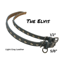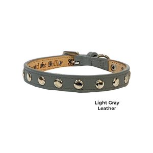 Named after Elvis, the beautiful Blue Frenchie from Dallas Texas. This leather dog collar is a classic with a single row of nickel studs handset in a single row.